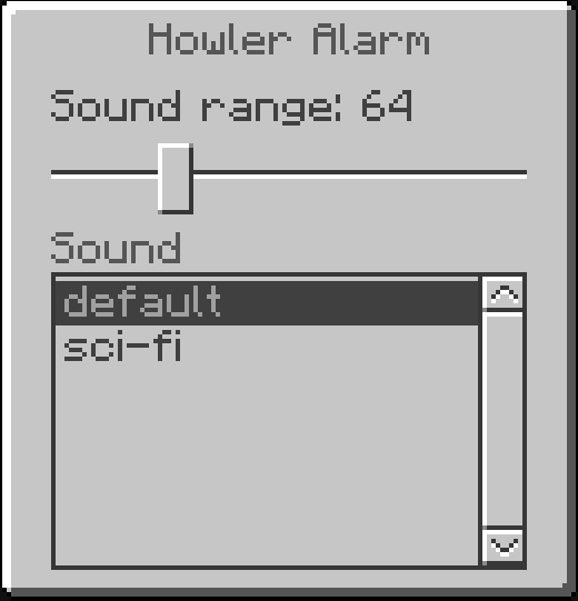 The Howler Alarm is triggered by Redstone and produces a loud audible alarm that can be heard for 64 blocks by default. The range of the alarm can be changed by right clicking on it. The Howler Alarm at its max setting can be heard 256 blocks away. It can be upgraded to an Industrial Alarm to change the color and add lighting effects.